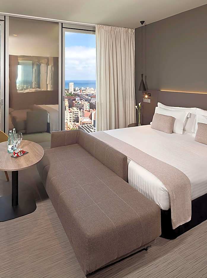 Located on the top floors of the hotel, this modern, air-conditioned room features fantastic views over the Mediterranean Sea. It comes with free Wi-Fi, flat-screen satellite TV, a mini-bar and Nespresso® coffee maker.