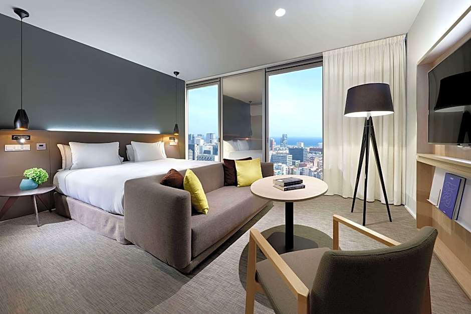 Located on the top floors of the hotel, this modern, air-conditioned room features fantastic panoramic views over Barcelona.
