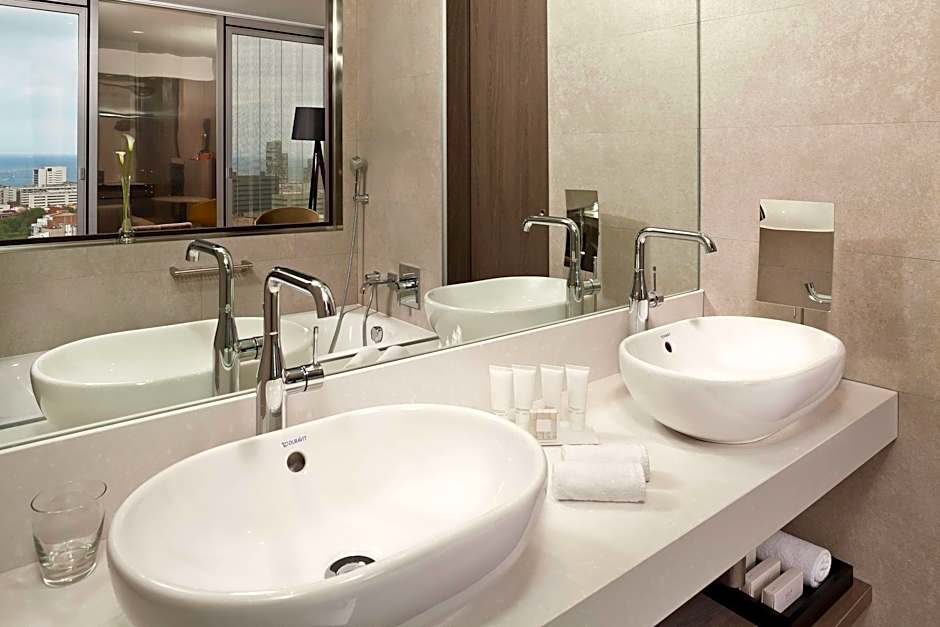 The room offers panoramic views of Barcelona and features a Nespresso coffee maker, a mini-bar and a flat-screen TV. The private bathroom has a rain-effect shower and includes The Level bathrobe and slippers.